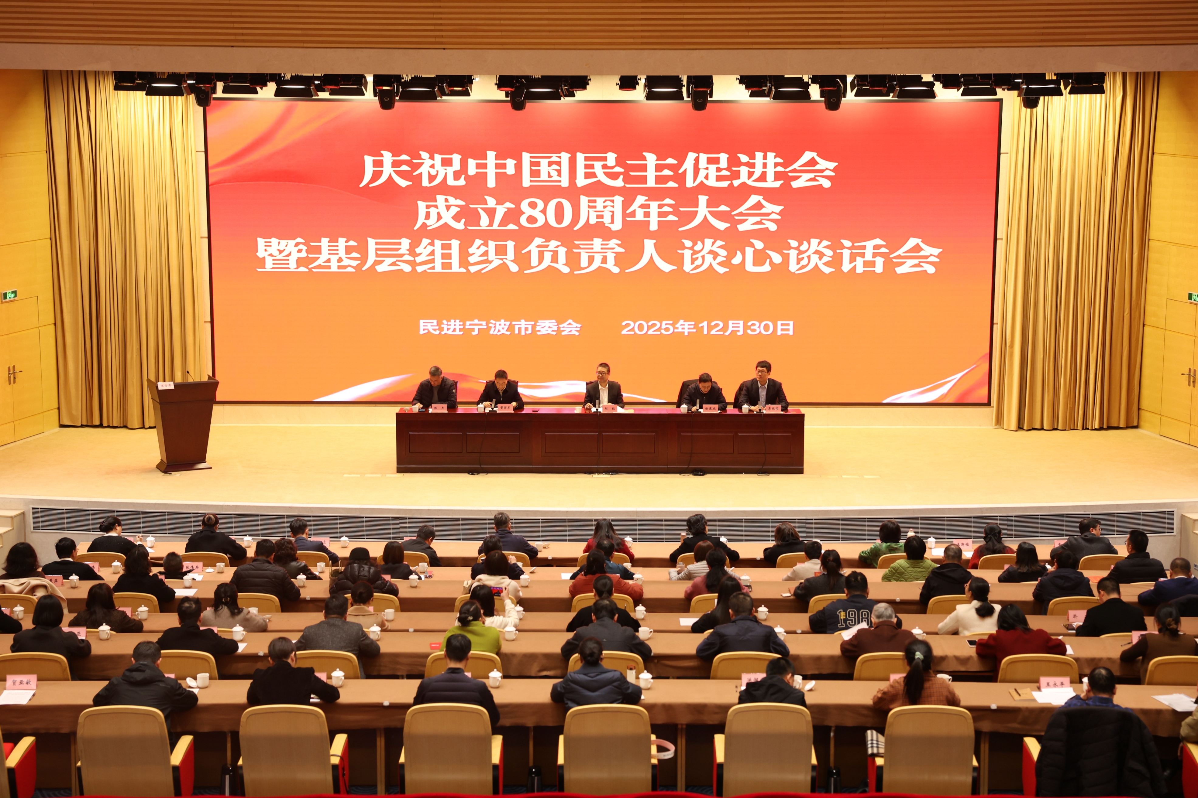 12月30日,民进宁波市委会在市行政会议中心举行庆祝中国民主促进会成立80周年大会暨基层组织负责人集体谈心谈话会。市政协副主席、民进宁波市委会主委刘毅出席会议并讲话,民进宁波市委会专职副主委徐建成、副主委李砚硕、陈杰出席会议,会议由市委会副主委董国军主持。